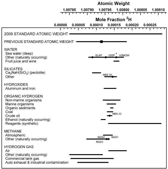 Because the atomic weight of an element varies across the Earth, the atomic weight of the element in a sample can sometimes help identify the origin of the sample. This variability allows climate scientists to estimate historical temperatures and determine carbon sources by measuring differences in isotope ratios between different samples. Observe the graph below, which indicates selected sources of hydrogen that have certain atomic weights and mole fractions of hydrogen-2.