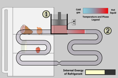 As the refrigerant is being compressed, it flows into the condenser (the coil on the right). In the condenser, the refrigerant releases energy to the surroundings. In this case, the immediate surroundings are the air outside the refrigerator. However, the energy is not transferred as work, but as heat. The refrigerant releases heat by condensing (how condensation releases heat will be fully discussed in Key Idea 5: Energy and Phase Changes). Because the refrigerant has been defined as the system, we say that the system has released heat to the surroundings, which causes the internal energy of the system to fall. This energy transfer occurs because of a temperature difference between the surrounding air and the refrigerant fluid, it is due to this difference that we refer to it as an act of heating.