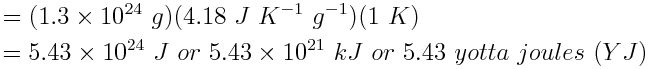 The volume of the world’s oceans is approximately 1.3×1021 L. Assuming that the specific heat capacity of seawater is 4.18 J K-1 g-1, how much heat can the world’s oceans absorb before increasing by 1 K?