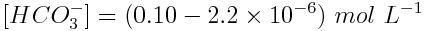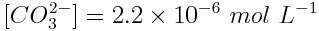 The chemical equation of the reaction shows tells us that if [H3O+] increased by 2.2×10-6 mol L-1, [CO32-] increased by the same amount and [HCO3-] decreased by this amount. Therefore, the equilibrium concentrations of these substances are: